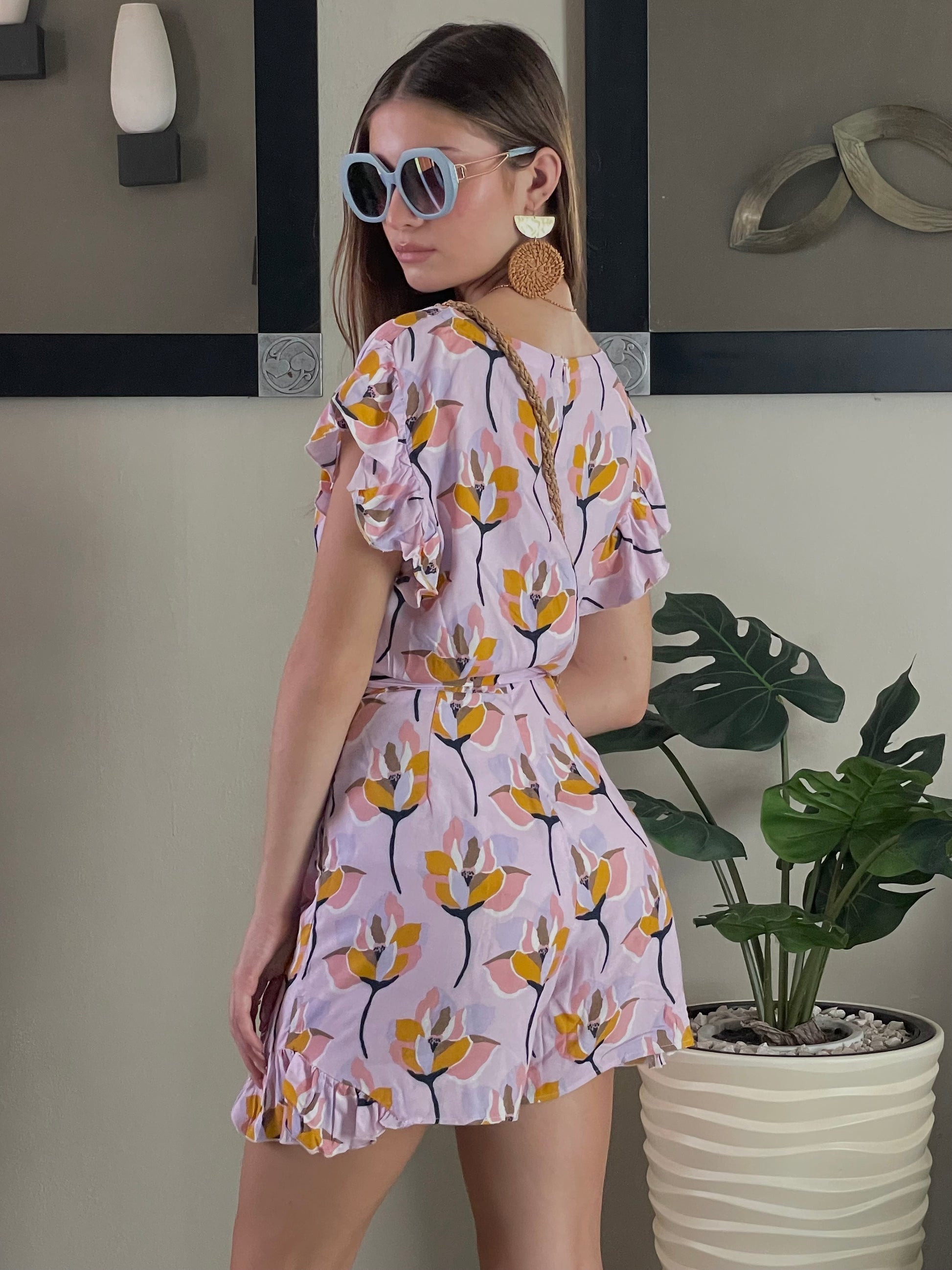 - Details: Romper en corte V, con volante en las mangas y en la parte del pantalón. Cierre en cremallera en la parte de atrás